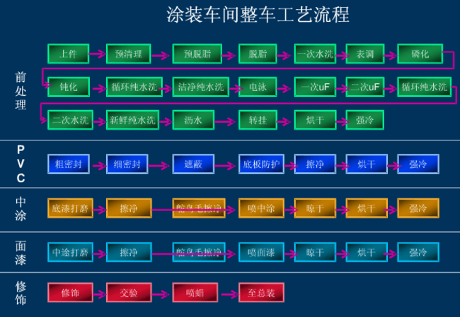 以下是涂裝車間整車線工藝流程中的細項說明:
